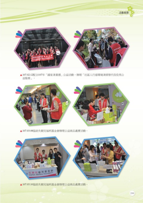 活動剪影 ▲ 107.02.12配合107年「國家清潔週」公益活動,辦理「社區人行道環境清掃替代役役男公 益服務」。 ▲ 107.03.08協助失親兒福利基金會辦理公益商品義賣活動。 ▲ 107.05.10協助失親兒福利基金會辦理公益商品義賣活動。 299